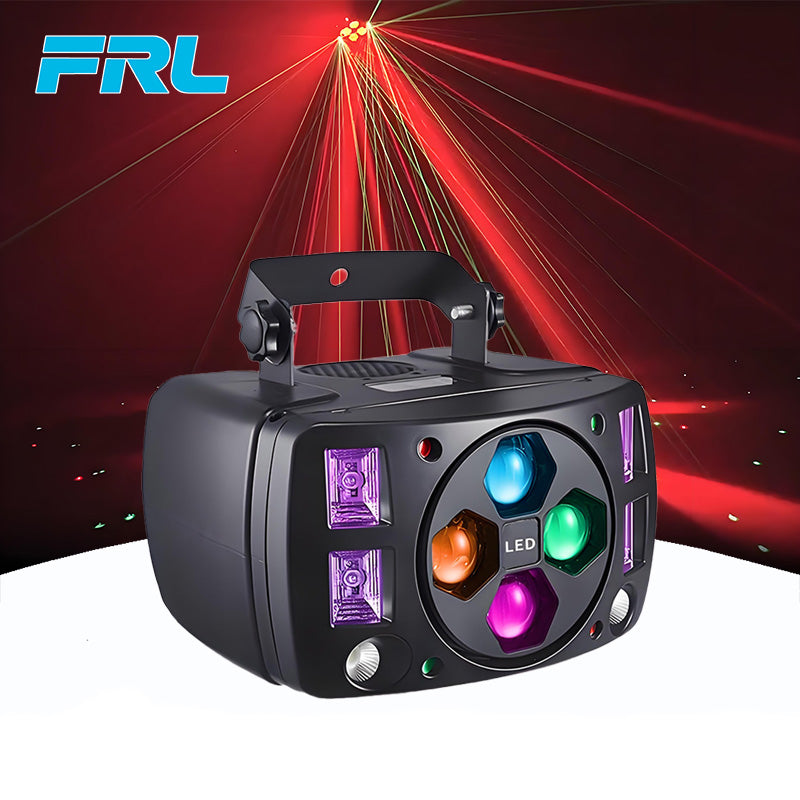Lamp parameters:4 15W four-in-one, 2 10W white light strobe, 4 3W purple light, 2 100mW red laser, 2 50mW green laser,